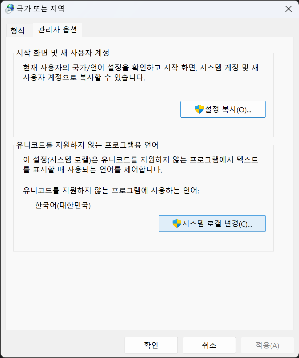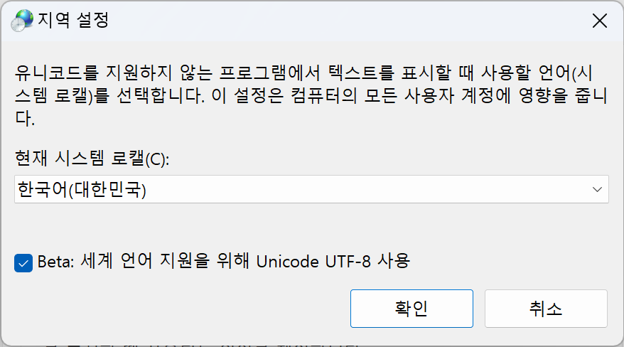이후 시스템 로캘 변경 - Beta: 세계 언어 지원을 위해 Unicode UTF-8 사용을 체크해 줍니다.