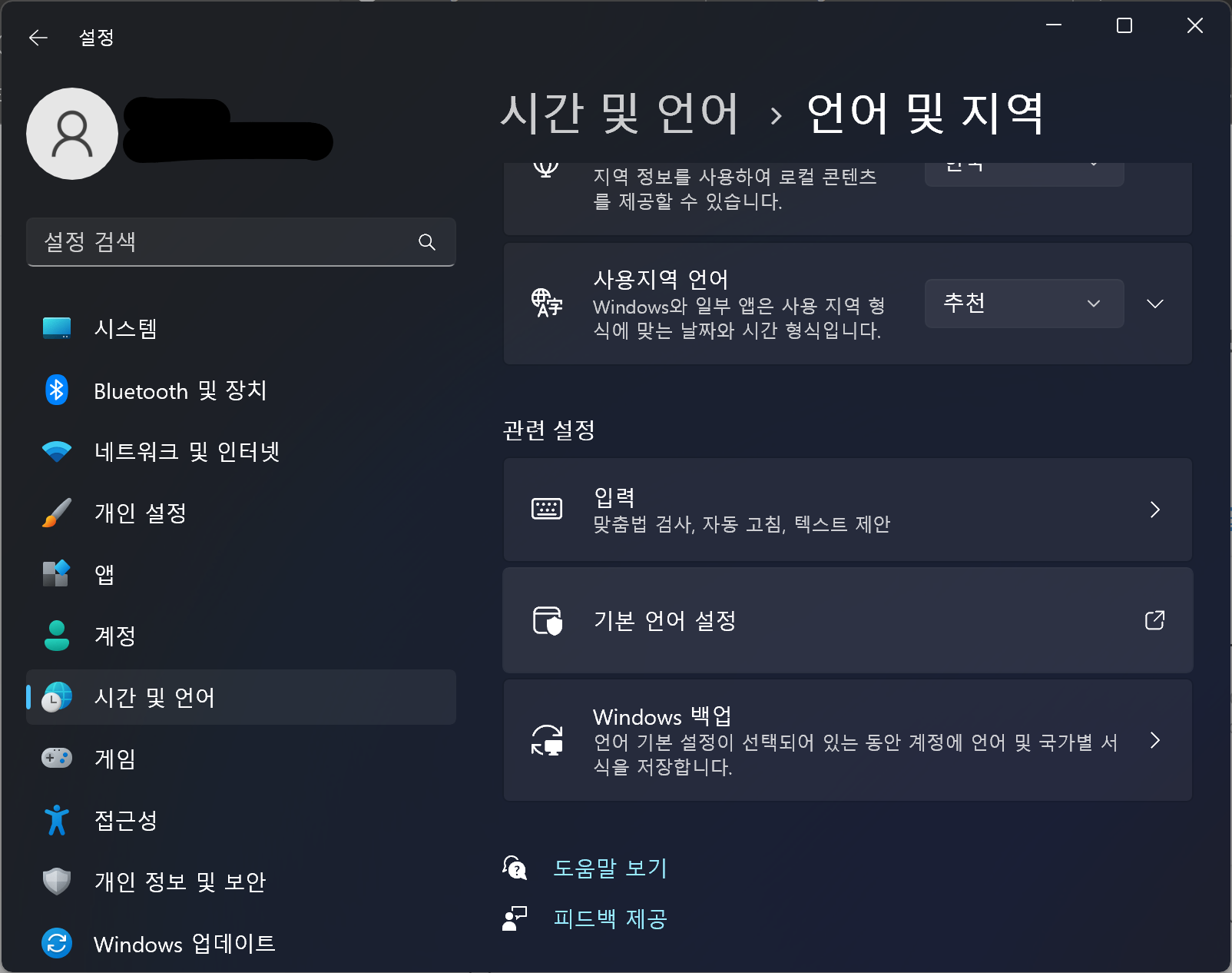 Windows 설정 - 시간 및 언어 - 언어 및 지역 - 기본 언어 설정을 클릭해 줍니다.