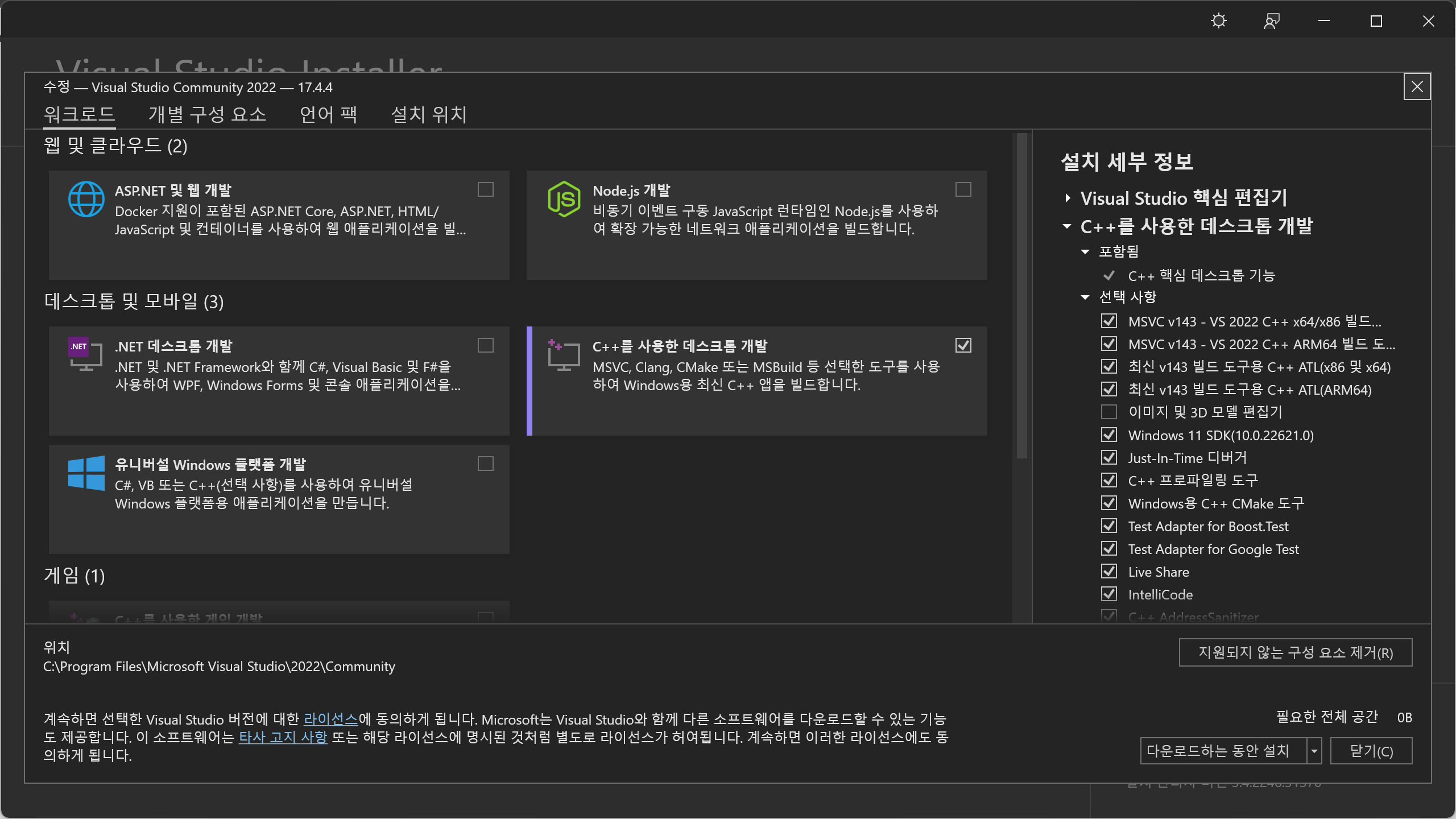 거창해 보이지만 어려울 건 없고, Visual studio 를 Desktop development with C++ 옵션을 선택해서 설치해 주면 됩니다.